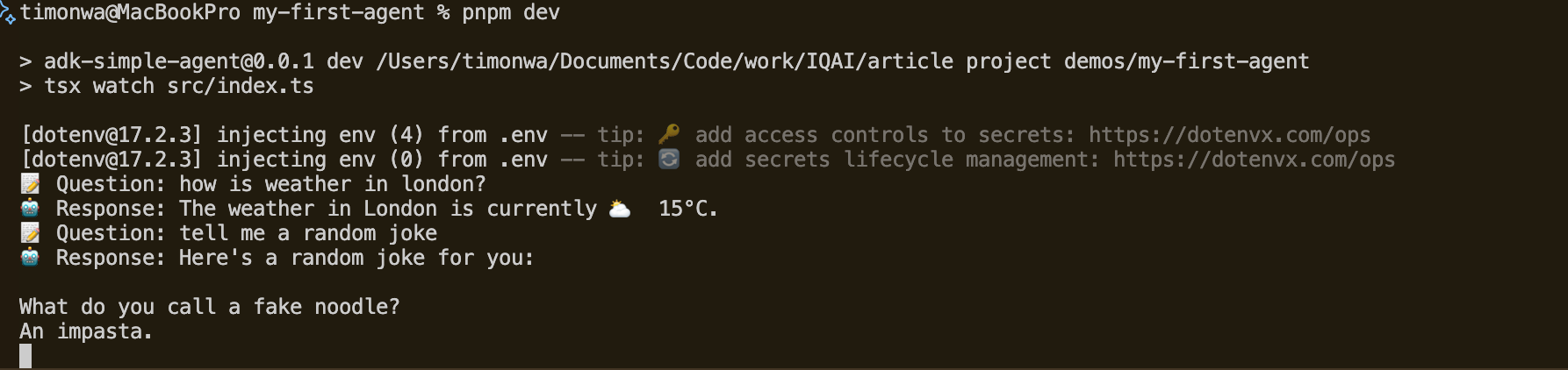 main().catch(console.error);This code creates our agent system and tests it with a couple of simple questions. The root agent automatically figures out which specialized agent should handle each request.