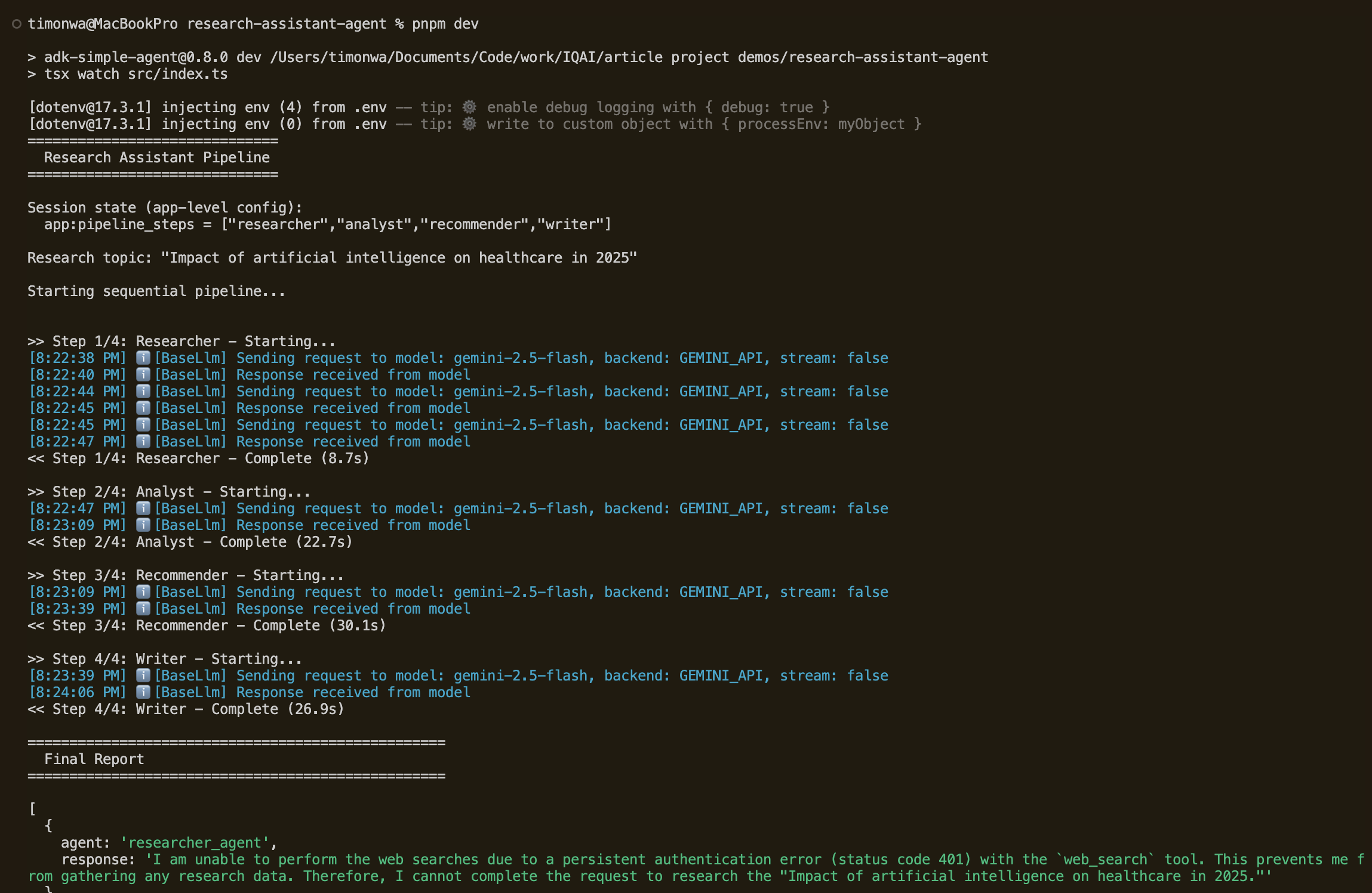 Run pnpm dev to execute the pipeline. Youâll see the agent callbacks log each stepâs start and completion with timing as the pipeline progresses. At the end, the memory service confirms the session was saved and is searchable.