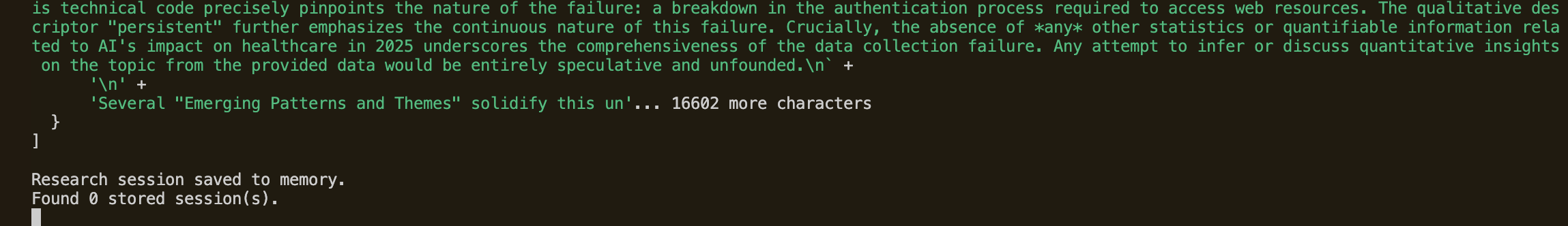 Without memory, every research session is a one-off. The pipeline runs, produces a report, and all intermediate data (search results, analyses, recommendations) are lost when the session ends. If a user researches âAI in healthcareâ today and âAI in drug discoveryâ next week, the second session has no way to build on the first. This is a common challenge across agent frameworks, not just ADK-TS.